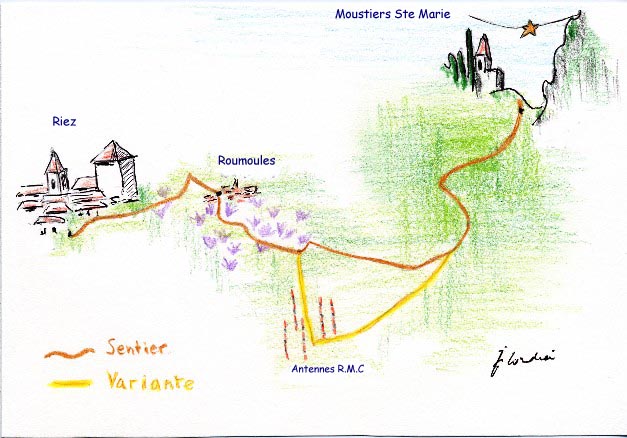 Ce chemin est très long, et fait un détour interminable en passant par les cinq pylônes antennes relais de Radio Monte Carlo.... (il n’y a rien de génial par là !) Le mieux est de suivre tout droit au carrefour le chemin rejoignant la route où l’on retrouve après, les balisages du GR® 4 qui remonte plein nord, avec en contrebas à droite le lac de Ste Croix.
