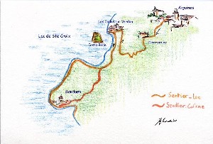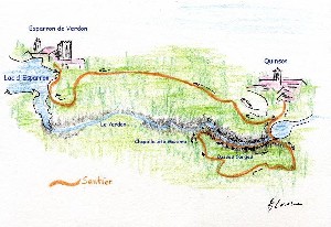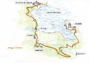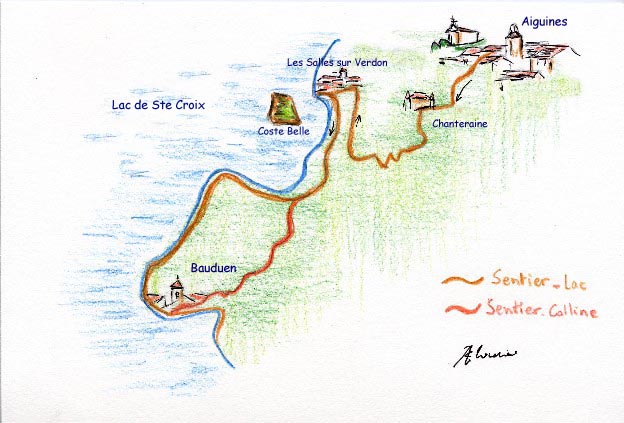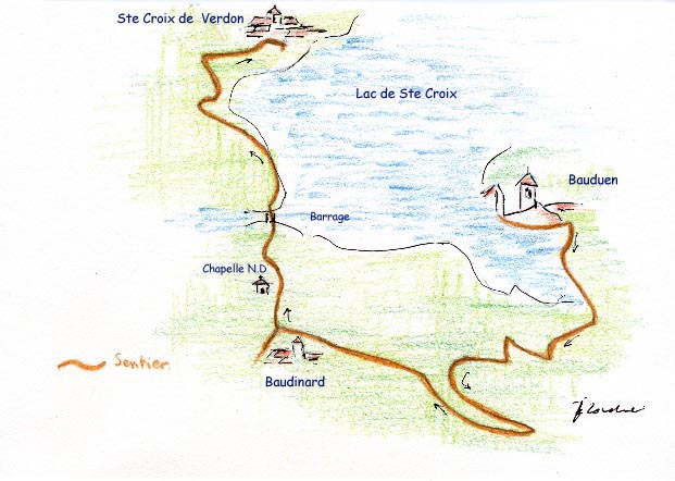 Il faut quitter Bauduen en suivant la route contournant l'extrémité Sud-Est du lac de Ste Croix. Prendre à gauche au carrefour et retrouver le sentier quelques centaines de mètres plus loin. Celui-ci s'élève, faisant découvrir le lac et Bauduen en face.