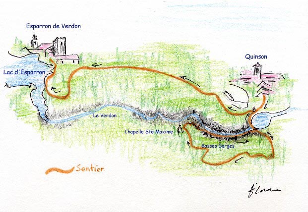 Une très belle balade consiste à monter à la Chapelle Ste Maxime, et redescendre par les basses gorges, ou vice versa. Mais attention, cette boucle qui n'a l'air de rien est très délicate : à entreprendre par beau temps, et par des randonneurs expérimentés. L'appellation de "Basses Gorges" n'est pas synonyme de facilité ; les falaises sont moins importantes que dans le Grand Canyon du Verdon, cela ne les empêchent pas d'être très dangereuses. Au départ du sentier, une pancarte informe les randonneurs sur les risques encourus : éboulements de roches, mains courantes endommagées, etc… et surtout… "Vous empruntez ce sentier à vos risques et périls." Important à savoir avant de s'y aventurer.