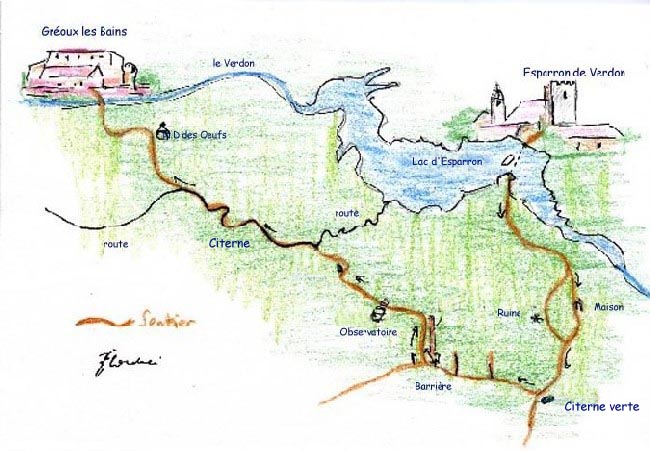 - Le plus simplement, prendre la petite route qui serpente par la forêt et le chemin au dessus du lac, avant de rejoindre la Départementale au barrage de Gréoux. Ce parcours est trop souvent sur la route.