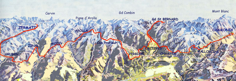 La Traversée glacière de Chamonix Zermatt est surtout connue l'hiver ou au printemps à ski. L'été, cette randonnée est moins fréquentée, et permet de rallier ces deux importants centres alpins en passant par les glaciers du Tour, de Trient, d'Otemma, d'Arolla, de Tsa-Tsan, et par des cols de hautes altitudes. Même si la plupart des randonneurs traversent le Val de Bagnes en car postal ou en stop, pour éviter une marche en vallée jugée "inintéressante", cette Haute Route par les glaciers est réservée aux alpinistes chevronnés. Il existe une autre "Haute Route", dont l'itinéraire m'a été communiqué par Valais Tourisme, et l'Union Valaisanne du Tourisme. Je l'ai quelque peu arrangé à ma manière... Malheureusement, les mauvaises conditions météo ne m'ont pas permis de faire ce que je voulais, et les amis (es) qui devaient m'accompagner ont déclaré forfait à Zermatt !!! Personne ne veut me suivre! sniff!!!... Tant pis! je pars seul.